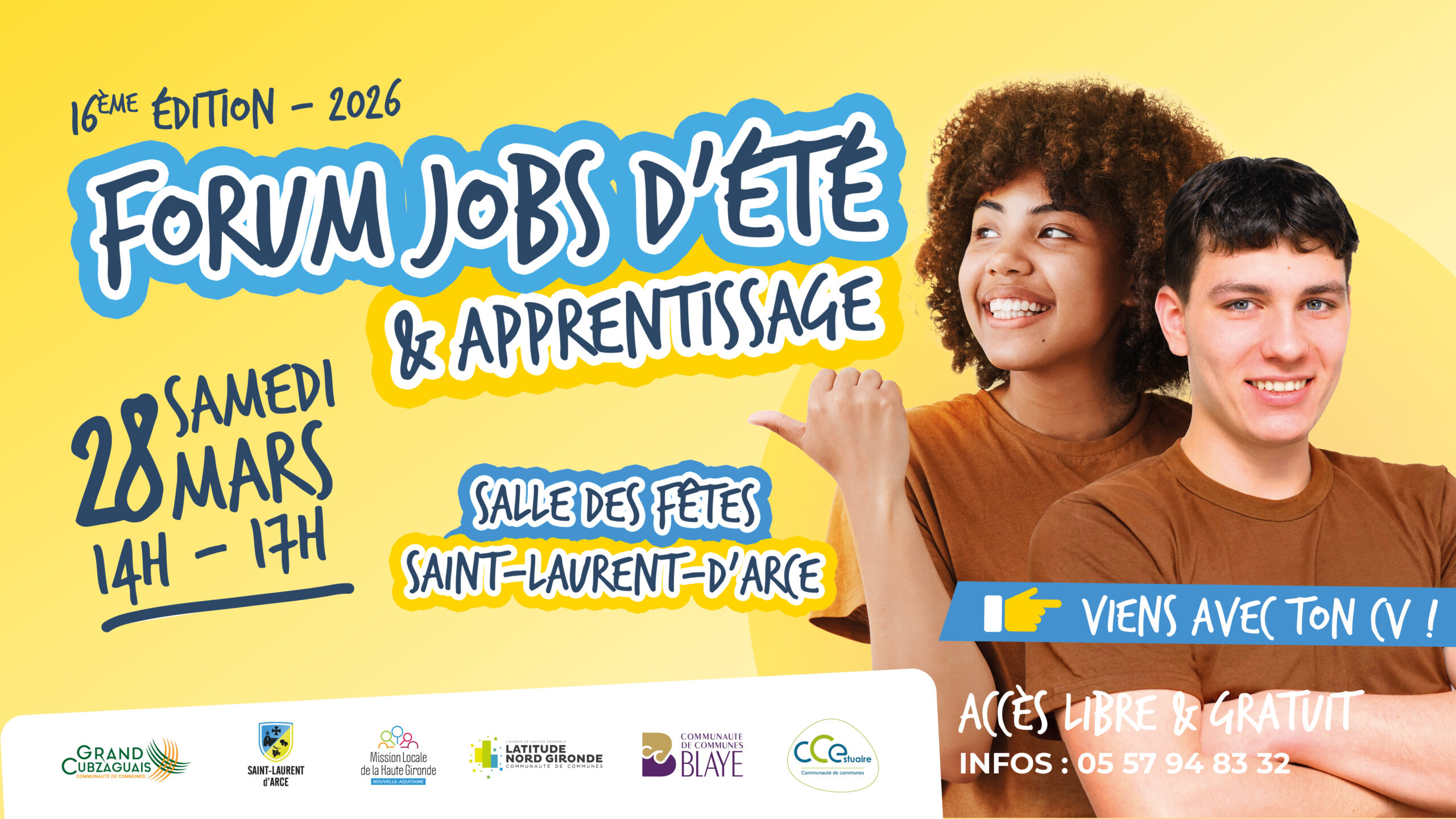 Premier job, premier apprentissage, premier CV… Pour beaucoup de jeunes, la recherche d’un emploi rime avec doutes, manque d’expérience et difficulté à décrocher un premier entretien. En Haute-Gironde comme ailleurs, “comment convaincre sans expérience ?”, “où trouver des offres près de chez moi ?”, “à qui m’adresser ?” sont des questions récurrentes. Pour répondre concrètement à ces préoccupations, les quatre communautés de communes de la Haute-Gironde, en partenariat avec la Mission Locale, organisent pour la seizième fois le Forum Jobs d’été et apprentissage, le samedi 28 mars 2026 de 14h à 17h, à la Salle des fêtes de Saint-Laurent-d’Arce.