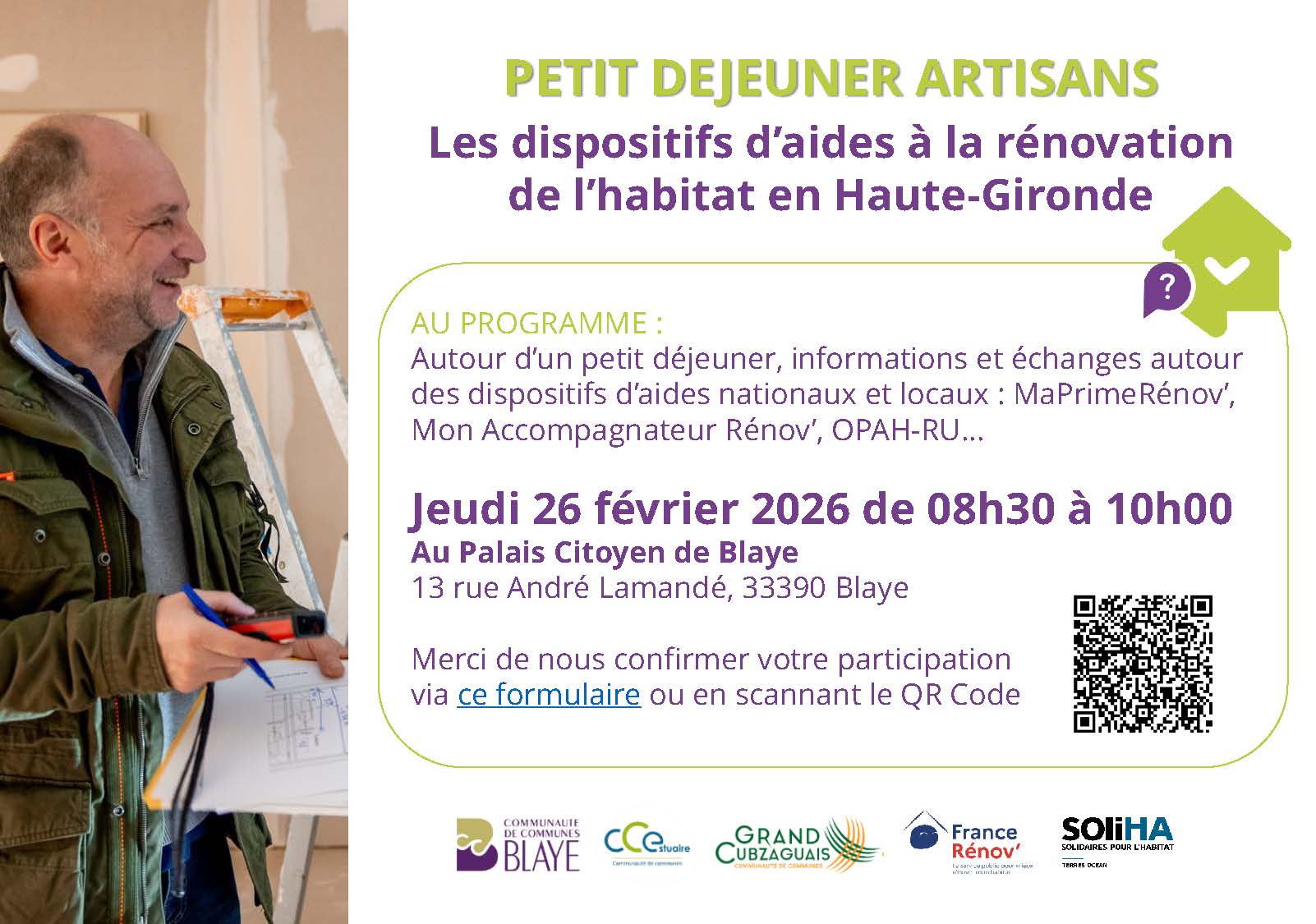 La Communauté de communes de Blaye, en partenariat avec SOLIHA, organise un Petit déjeuner Artisans dédié aux dispositifs d’aides à la rénovation de l’habitat en Haute-Gironde. Ce temps d’information et d’échanges se tiendra jeudi 26 février 2026, de 8h30 à 10h, au Palais Citoyen de Blaye.