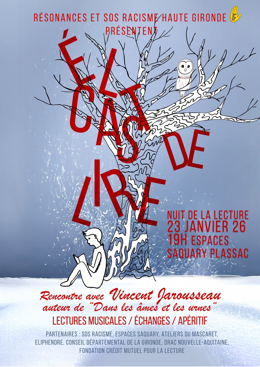 Résonances et SOS Racisme Haute Gironde vous invitent à « Éclats de Lire », une soirée placée sous le signe de la lecture et de l’échange, à l’occasion de la 10ᵉ édition des Nuits de la lecture, dont le thème est « Villes et campagnes ».